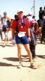 2. Sahara-Marathon 26.02.2002 Laufen für einen guten ZweckNein man hat mich nicht in die Wüste geschickt, ich war freiwillig da..... Im November 2001 stöberten Kerstin und ich im Internet, auf der Suche nach einem kleinen Abenteuer um den langen Winter zu überbrücken. Wir wurden auch sehr schnell fündig, die Ausschreibung des Saharamarathon im Februar 2002 fand sofort unser Interesse. Gesagt getan ,hatten wir uns auch gleich angemeldet. Somit war auch genug Motivation, besonders für Kerstin auch im nicht immer angenehmen Winterwetter zum stetigen Training gegeben. Am 23.02.02 war es dann so weit. Wir flogen von Frankfurt über die Alpen, am " Ballermann" vorbei, nach Afrika. Zuerst über Tunesien , und dann über der Sahara rechts abzubiegen , unserem Zielort entgegen. Der Flug über die Wüste dauerte ungefähr 1h40min. Aus 10 000m zeigte sich die unter uns liegende Landschaft teils in sehr bizarren Formen. Gebirgsketten wechselten sich ab, mit skurrilen Dünenlandschaften , ausgetrocknete Flussbette waren zu erkennen, und ab und zu eine geteerte Straße, die ewig gerade aus zu gehen schien. Und die ersten Gedanken an den Marathon, in so einer gigantischen Landschaft. So etwas wie eine Vorfreude auf das Ungewisse machte sich bei uns breit. Dann endlich die Landung in Tindouf. Es hatte den Anschein, das wir an diesem Tag die einzigen waren, die es hierher verschlagen hatte. Nachdem wir unser Gepäck in Empfang genommen hatten , mussten wir durch die Zollkontrolle. Und tatsächlich wollte man den Inhalt meines Rucksacks begutachten. Also ausräumen , die Kontrolle dauerte genau so lange bis der Zöllner den Beutel meiner Gastgeschenke entdeckt hatte, und ich ihm ohne größere Gegenwehr eine Tüte mit Bonbons überlassen hatte, sofort war die Durchsuchung beendet, und ich konnte so zusagen einreisen. Dann wurde im Teamwork das Gepäck au einen LKW verladen, und wir begaben uns in die wartenden Busse. Der TÜV hätte seine Freude an diesen Fahrzeugen gehabt, aber Sie brachten uns doch mit recht zügiger Fahrweise sicher ans Ziel, nach Smara. Dort wurden wir von unseren Gastfamilien schon sehnsüchtig erwartet. Jede Familie hatte ein Schild mit der entsprechenden Nummer. Da wir Alle auch durchnummeriert waren, fanden sich alle schnell bei der richtigen Familie ein. Wir bezogen unser Zelt, das sehr sauber und gemütlich war, es war etwas spartanisch eingerichtet, und nach dem man die Beleuchtung mittels Autobatterie zum funktionieren gebracht hatte, begann man mit der sogenannten Teezeremonie. Hier bei handelt es sich um eine spezielle Art sehr süßen grünen Tee aus einer gewissen Höhe in kleine Teegläser einzugießen , bis sich dieser durch eine gewisse Schaumkrone auszeichnet. Die Zeremonie zieht sich dann über drei Aufgüsse hin, und ist ein wichtiges Ritual. Trotz gewisser Verständigungsprobleme war eine sehr herzliche Stimmung, und man fühlte sich gut aufgehoben. Überhaupt muss man sagen, das die Organisation unter den gegeben Möglichkeiten hervorragend geklappt hat. Gefrühstückt wurde immer bei den Familien, Mittag und Abendessen gab es immer gemeinsam im Gemeindehaus, und das mit Auswahl und immer reichlich. Es wurden auch verschiedene Ausflüge angeboten, und Abends gab es Festlichkeiten mit einer Einheimischen Band die wirklich eine klasse musikalische Unterhaltung bot. Die Sportministerin war zu Besuch , und sogar der algerische Staatspräsident war das erste mal seit 27 Jahren in Smara. Wenn man zwischen den Lehmhütten und Zelten durch die Stadt läuft, wird man mit Sicherheit sehr nachdenklich , man befindet sich in einer anderen ungewohnten Welt, ja man könnte manchmal meinen in einem anderen Zeitalter. Vieles sieht für unsere Verhältnisse sehr ärmlich aus, aber ich hatte nicht den Eindruck das die Leute deswegen sehr unglücklich sind. Ich für meine Verhältnisse kam zu dem Schluss, das wir uns mit viel zu viel unnötigem Zeug belasten , uns wegen irgendwelcher materealistischen Sachen die wir vielleicht gar nicht unbedingt brauchen in irgendwelchen Stress versetzen, und mancher dann deswegen frühzeitig ins Gras beist, und die wichtigen Dinge im Leben gar nicht richtig wahrgenommen hat. Am 25.02.02 war es dann soweit , endlich laufen. Um 6 Uhr aufstehen , eine Tasse Kaffee, Weisbrot mit Marmelade, zunächst warm anziehen, und dann gemütlich zum Startplatz gehen. Kerstin wurde mit den anderen Halbmarathonläufern in mehrere LKW verfrachtet, und zum Startplatz gefahren, was auf dem LKW schon ein wenig abenteuerlich war, aber den Mädels schon vor dem Start sehr viel Gaudi brachte. Nach dem Sonnenaufgang wurde es langsam warm, und ich suchte mir unter den Zuschauern ein " Opfer " dem ich meine lange Trainingshose und meinen Vliespulli schenken konnte. Pünktlich um 9 Uhr gings dann auch los. Mein Strategie die ich mir zurecht gelegt hatte war ganz einfach. Als Kontrolle und " Bremse" hatte ich zum ersten mal beim Wettkampf meinen Pulsmesser um. Die erste Stunde also im Trainingstempo max. Puls 140 , diese Taktik sollte sich bewähren. Ich lief also sehr dezent los, nahm mir sogar die Zeit ein paar Fotos zumachen, war auch innerlich erstaunlich ruhig, und lies dann einfach alles auf mich zukommen. Bei Kilometer 12.5 an einer Wasserstelle war ich dann auf Erwin aufgelaufen, der es auch erst einmal recht gemütlich anging, ein paar kurze Worte ein Foto , und weiter gings. Jeder lief seinen eigenen Trott, ich genoss auch dieses alleine laufen, und bei Km 20 verlor ich dann auch Erwin aus den Augen , er war einige Schritte schneller unterwegs als ich. Aber eins hatten wir gemeinsam, wir rollten langsam aber stetig das Feld von hinten auf. Je länger man unterwegs war, um so größer waren dann auch die Abstände zum nächsten Läufer, man war tatsächlich ganz für sich , und mit sich alleine und konnte seine Gedanken freien Lauf , und die Landschaft , auf sich einwirken lassen. Die zweite Hälfte der Strecke erwies sich auf Grund der etwas schlechteren Bodenv