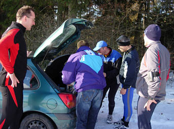 ![]() Das Laufen bei so kalten Temperaturen macht hungrig. Wie gut, dass Gerd mit dem Verpflegungswagen da ist. |
