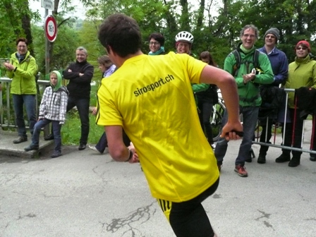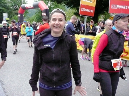 Sonntagmorgen: Es ist trocken, 7°C morgens um 8 Uhr. Und ein sehr stark Wind, somit fühlt es sich kälter an. Vor dem Start treffe ich mich mit einer Arbeitskollegin und wir gehen erst 5 min vor dem Start in die Kälte raus. Sie startet weiter vorne, läuft viel schneller als ich. Ich mache das Schlusslicht. Die ersten km sind noch auf Asphalt, aber dann geht es in den Wald auf Naturstrasse. Teilweise noch nass und rutschig, Vorsicht ist geboten bei den Passagen mit Matsch, Steinen und Wurzeln. Was für eine Überraschung, bei km9, stehen meine Freunde Rosie und Felix und feuern mich an. Damit habe ich absolut nicht gerechnet  und muss sie gleich umarmen. Ein totaler Motivationsschub, jetzt bloss nicht übermütig werden. Es geht lange der Töss flussaufwärts entlang, d.h. leichte Steigung. Im Sennhof komme ich voll in den Regenschauer (der war nur lokal aber ich habe ihn erwischt – Glückspilz). Dann eine kurze aber knackige Steigung, in der 1. Runde geht das noch aber in der zweiten? Bald haben wir den höchsten Punkt erreicht und jetzt geht es abwärts. Teilweise auch rutschig mit Steinen und Wurzeln. Ich beende die 1. Runde und mache einen kurzen Stopp bei meinem Schatz. Er filmt und ich wechsle meine Trinkfläschchen.