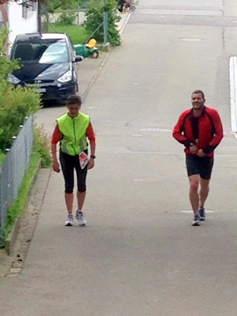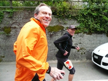 Und ab geht es in die 2. Runde. Hoffentlich nicht wieder alleine wie in der 1. Runde. Mal sehen was sich ergibt. Bereits nach 500m werde ich von hinten angesprochen. Adi, der Mann einer Arbeitskollegin hat mich von hinten erkannt. Er läuft in der Staffel. Wir machen Fotos und weg ist er. Bei km22 treffe ich Andi. Er läuft seinen 1. Marathon und ich schliesse mich seinem Tempo an. Das ist viel angenehmer als alleine zu laufen. Wir treffen wieder auf Rosie und Felix (beide mit dem Bike) und bei km28 nochmals. Das gibt Motivation. Jetzt kommen wieder die heiklen 2km bei denen Vorsicht geben ist.