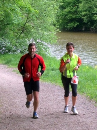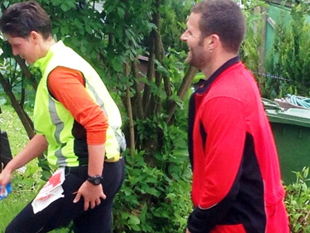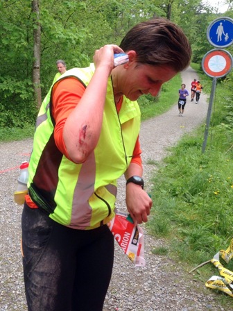 Aber schon zu spät, ich rutsche und schon liege ich flach. Fotokamera knallt auch zu Boden. Andi hilft mir auf die Beine. Schadensbegutachtung; Ellbogen schmerzt und ist aufgeschlagen, aber ich laufe weiter. Von da an ist mir schummrig, aber nicht schlimm. Schon sehen wir Rosie und Felix wieder und ich berichte von meinem Sturz. Kurz danach kommt der Sanitätsposten, die sind schon informiert. Ellbogen wird desinfiziert und weiter geht es. Noch schnell ein Gel und Wasser, vielleicht ist mir dann weniger schwindlig. Andi hatte ich weitergeschickt und so begleiten mich Rosie und Felix 3km auf dem Bike. Das ist gut so, denn ich habe eine Krise und würde am liebsten gehen. Da die beiden bei mir sind fühle ich mich jedoch sicher und laufe weiter. Wir holen Andi wieder ein und so fahren Rosie und Felix zum nächsten Punkt. Jetzt kommt erneut die kurze knackige Steigung, wir gehen. Und Rosie und Felix reden uns gut zu. Bis zum höchsten Punkt machen wir nochmals eine kurze Gehpause und dann lassen wir es rollen – so gut wie man nach 35km noch kann. Aber ich passe an den kritischen Stellen auf, damit ich nicht noch einen Sturz habe.
