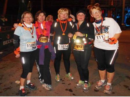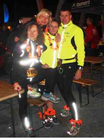 Das sind Annegret, Marie-Theres und Daniela nach 5 km im Ziel. War ganz schön anstrengend. Aber wir hatten Spaß, was man am Lächeln gut erkennen kann. Nach ein paar Stärkungen und Energie-Drinks waren wir schnell wieder fit.