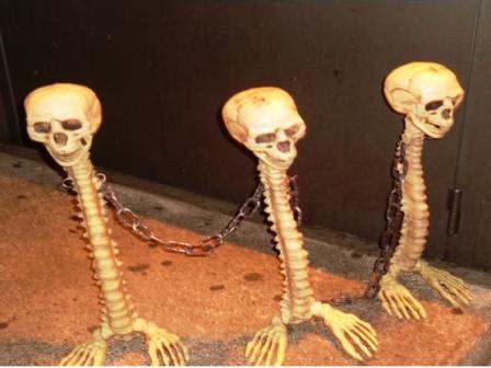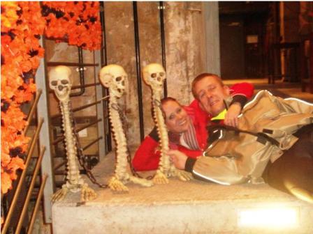 So gruselig sieht es bei Tageslicht nicht aus, das soll sich aber bald ändern. Wir schauen uns um und reservieren einen Tisch, wo wir unseren mitgebrachten Kuchen später nach dem Lauf wohlverdient genießen können. Hier gibt es immer etwas zu gucken. Vor allem die tolle Dekoration hat es uns angetan.