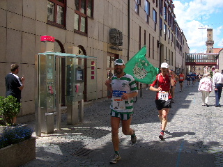 Ralf und Helmut sind dabei. In Fürth treffen wir noch viele Bekannte. Natürlich Thomas (sein Bildbericht), er läuft heute den HM. Am Bahnhof treffe ich Jürgen (Jürgens Bildbericht) und Erwin (Erwins Bildbericht). Es wird ein bisschen gedehnt und dann reihen wir uns in die Startaufstellung ein. Eine schöne, abwechslungsreiche Strecke erwartet uns mit Verpflegungsstellen "ohne Ende". Genügend Wasser zum Nass machen, Partystimmung pur und viele Zuschauer. Es sind sehr viele Leute sowohl an der Strecke als auch im Start- Ziel Bereich. Eigentlich hätte der Marathon „Brückenmarathon“ heißen müssen. Irgendwann haben wir das Zählen aufgehört, so oft sind wir über Frankenschnellweg, Autobahn, Kanal, Regnitz + diverse Fußgänger- und Radfahrerbrücken gelaufen. Aber die Zuschauer haben uns immer wieder motiviert.
