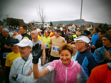 Es ist sehr selten, dass ein Zugläufer am Ende noch eine richtige Gruppe um sich hat. Heute ist es aber so. Zwar mit strengem Regime, aber lustig und erzählend führe ich uns durch die 3 Anstiege bis zum Staffelberg (Hälfte). Wir laufen ruhig wie die Nürnberger Bahnhofsuhr und wir bleiben fest zusammen. Bis km35, dann schicke ich 2 vor, die laufe noch so locker. Ein paar von uns  machen einen halben Schritt langsamer. Und die 6 um mich bleiben eng zusammen, auch wenn’s jedem schwer fällt. Ich erzähle ein paar Witze, so werden auch die faden Geraden erträglich.