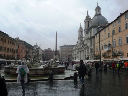 Bei km 40 wird der Obelisk auf der Piazza Popolo umrundet: Kopfsteinpflaster und strömender Regen (s. Video )