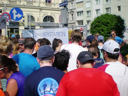 Um den Prater-Stern herum – Startblock 3 rechts, und wir im Startblock 4 links herum. Erster Blick aufs Riesenrad. Bei KM 5, an der 1. Verpflegungsstation nimmt das Unheil seinen Lauf: Hier treffen die beiden Startblöcke aufeinander, und es ist den...